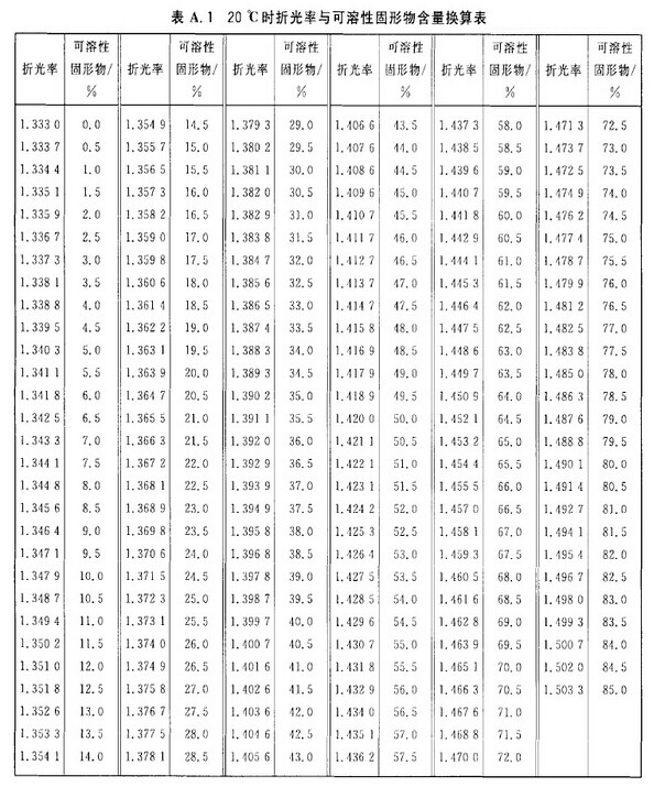 在20ºC用折光汁測量待測樣液的折光率,并用表A.1查得或從折光計上直接讀出可溶性固形物含量。