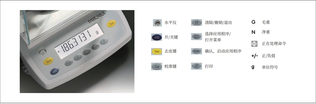 - 【注:BSA 系列天平內置多種應用程序,如稱重、密度測定、百分比、計數(shù)、不穩(wěn)定條 件稱量(動物稱量)、凈重 - 總重、求和、系數(shù)換算、稱量單位切換等,用戶可以根據(jù) 需要在菜單中選擇所需程序,并按提示進行進一步操作!