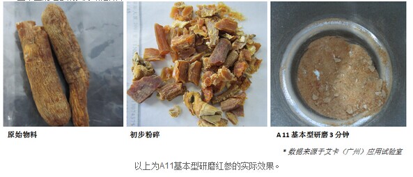 在制備為試樣水解液之前,還有非常關(guān)鍵的一步——粉碎/研磨——直接關(guān)系到紅參中有效成分的釋放。請(qǐng)參考A11基本型對(duì)紅參的實(shí)際研磨效果: