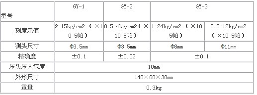 刻度示值:0.5-4kg/cm2(×10 5帕) ; 測頭尺寸 :Φ3.5mm ; 精確度 ±0.02 ; 壓頭壓入深度:10mm ; 外形尺寸 :140×60×30mm ; 重量 :0.3kg ; 備注:測香蕉等軟蘋果。